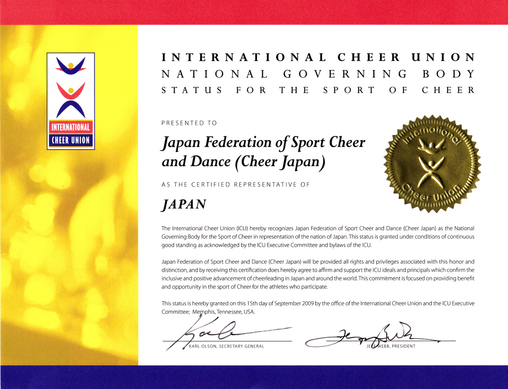 Cheer Federation for Sport Cheer and Dance (Cheer Japan) Secretary General: Satoko ISHIJIMA Sakamotoya Bldg. 302, 1-18-12 Yotsuya, Shinjuku-ku Tokyo 160-0004, JAPAN