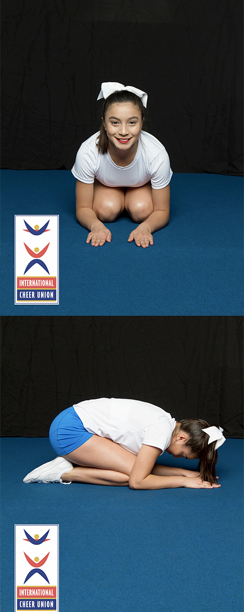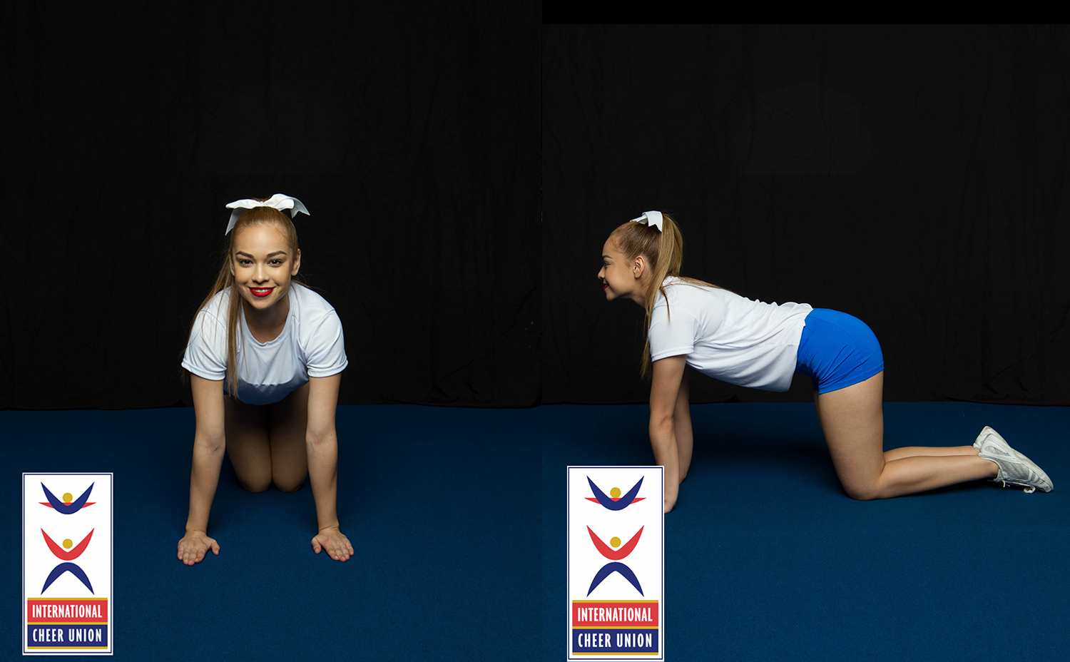An “All 4s Position” is when an athlete is on their hands and knees on the performing surface but not in a tucked (nugget) position. When this person is supporting a top person, the “All 4s” position is a waist level stunt. | |