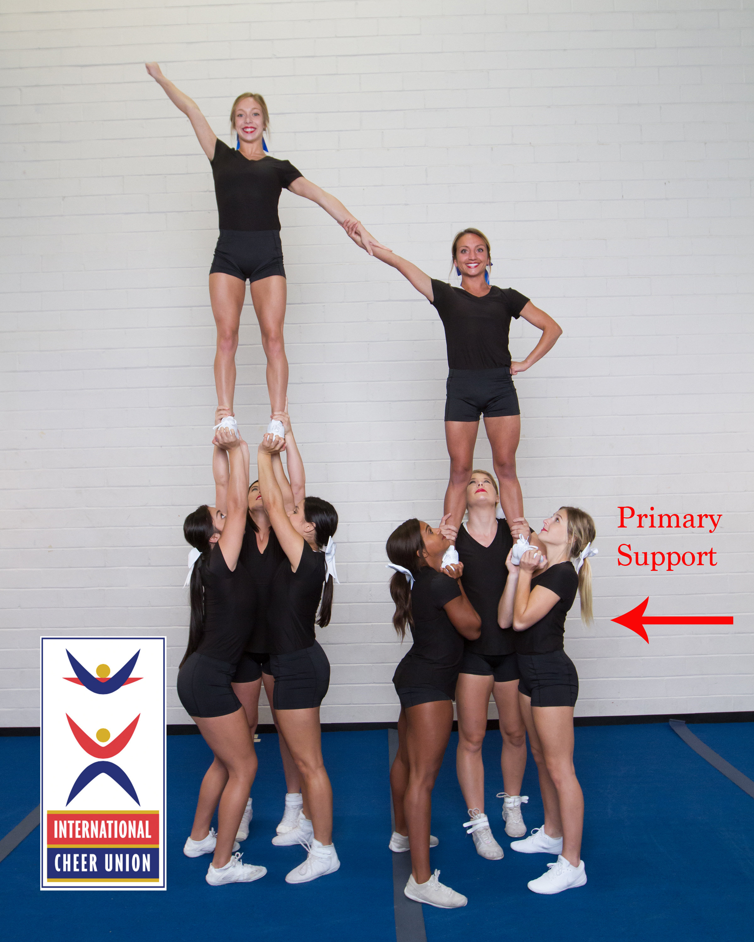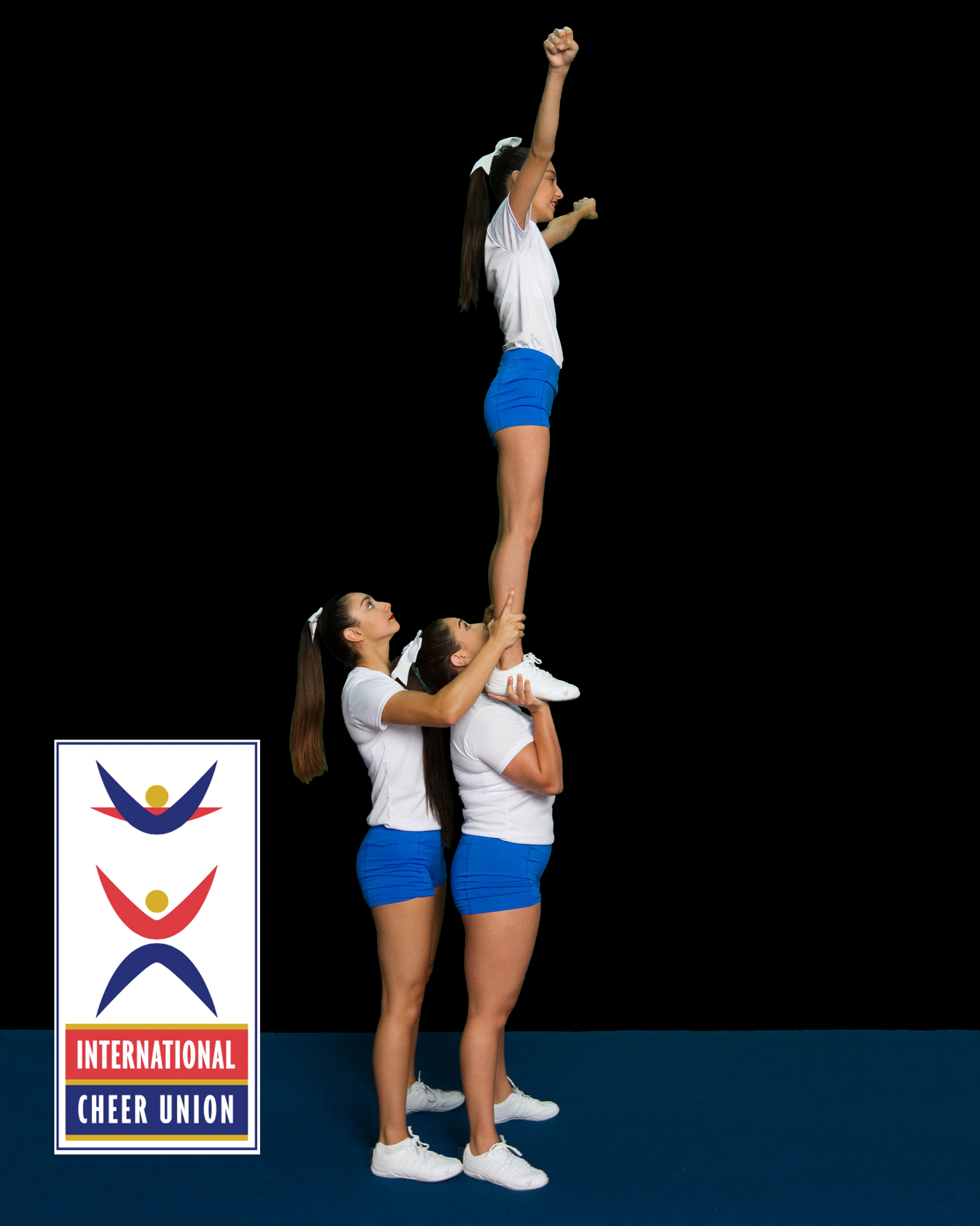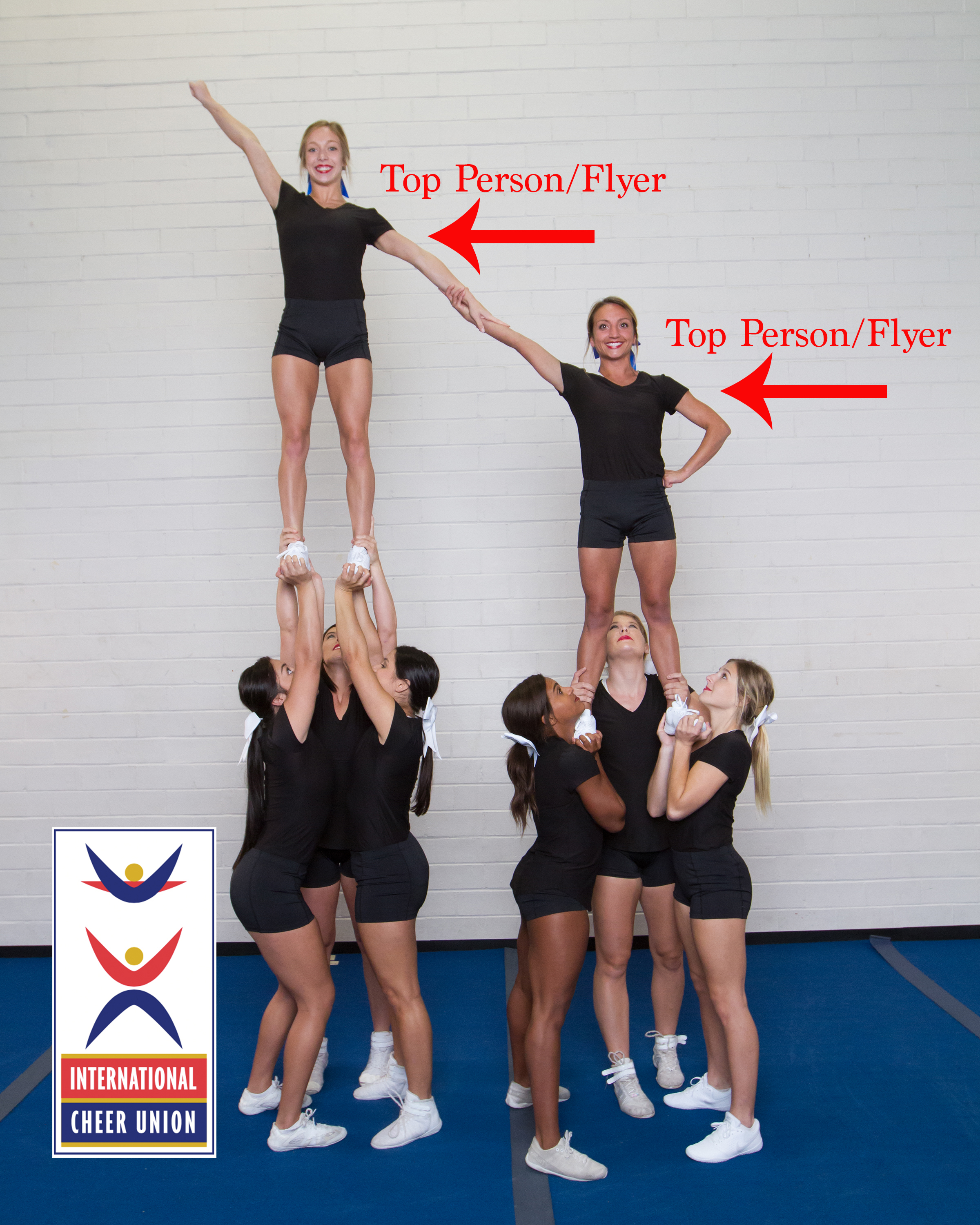 Any skill in which a top person is supported above the performance surface by one or more persons. A stunt is determined to be “One Leg” or “Two Leg” by the number of feet that the top person has being supported by a base(s). If the top person is not supported under any foot than the skill will be considered a “Two Leg” stunt. | |
