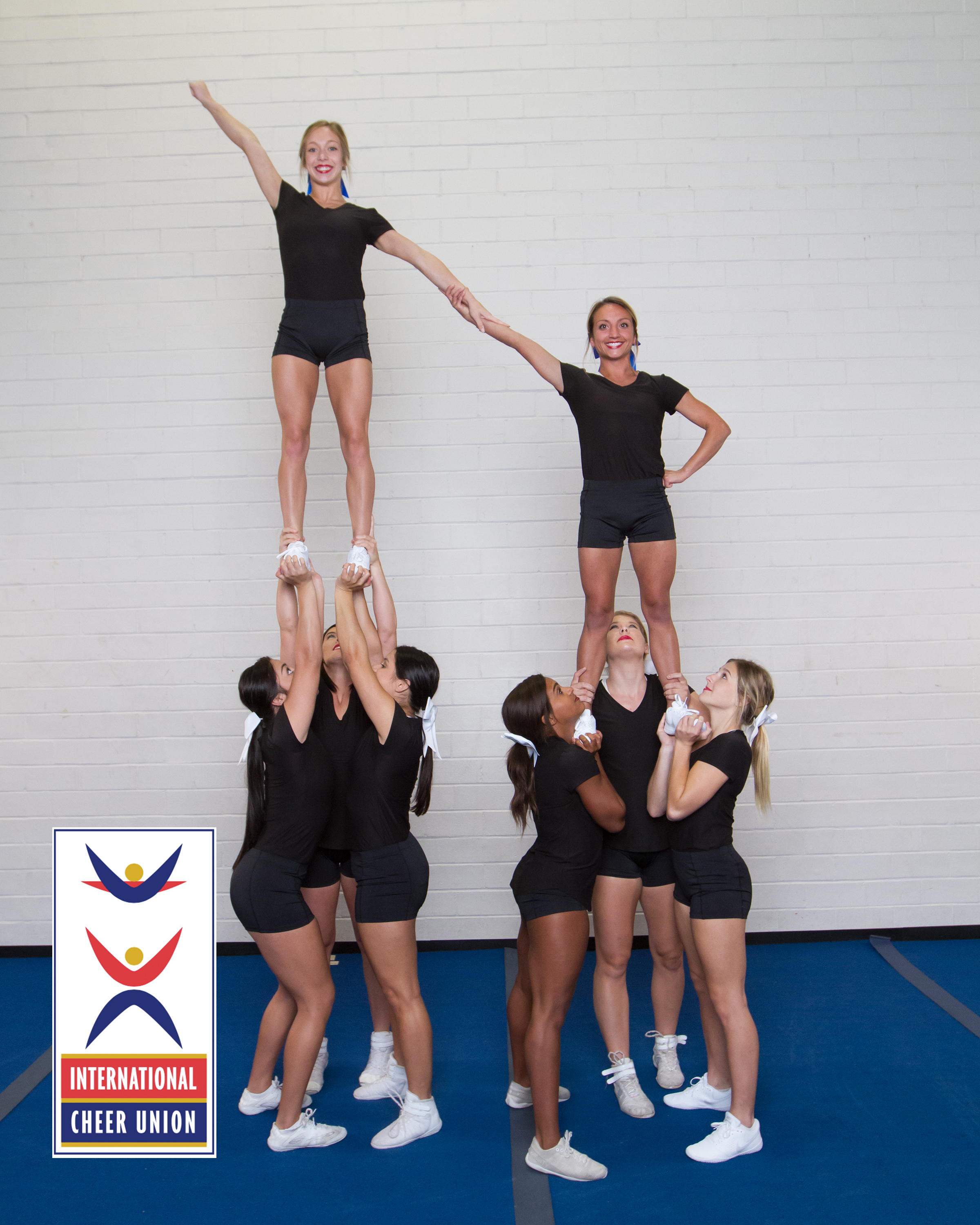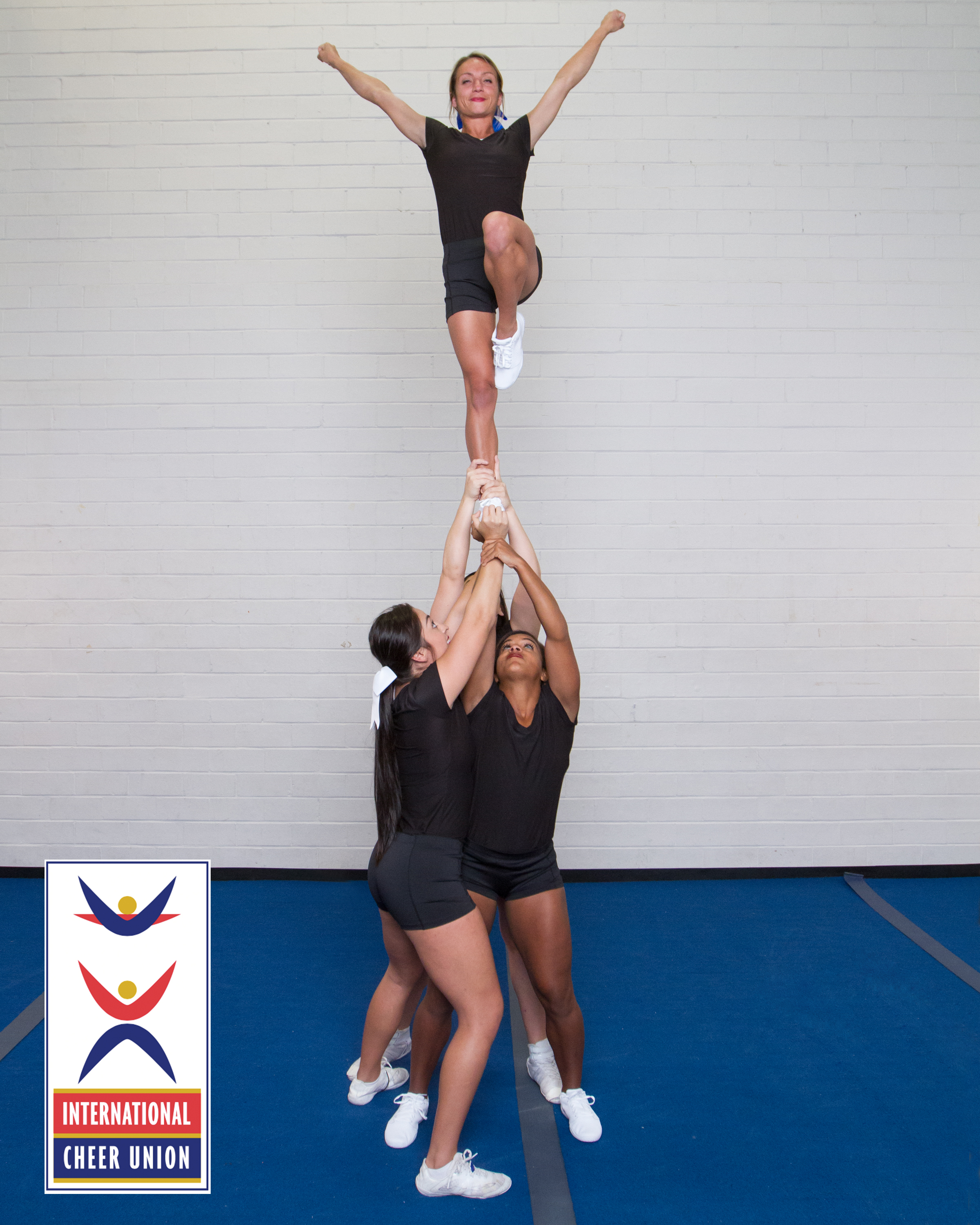 When the entire body of the top person is extended in an upright position over the base(s). Examples of “Extended Stunts”: Extension, Extended Liberty, Extended Cupie. Examples of stunts that are not considered “Extended Stunts”: Chairs, torches, flat backs, arm-n-arms and straddle lifts. (These are stunts where the base(s) arm(s) are extended overhead, but are NOT considered “Extended Stunts” since the height of the body of the top person is similar to a shoulder/prep level stunt.) | |