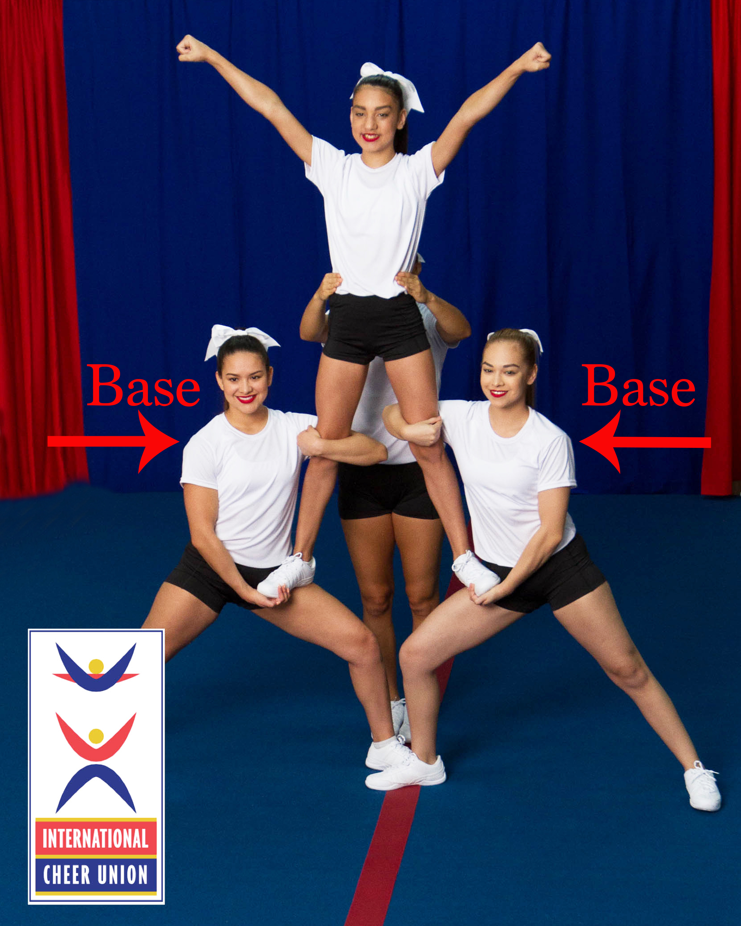 A person who is in direct weight-bearing contact with the performance surface who provides support for another person. The person(s) that holds, lifts or tosses a top person into a stunt. (See also: “New Base” and/or “Original Base”). If there is only 1 person under a top person’s foot, regardless of hand placement, that person is considered a base. | |