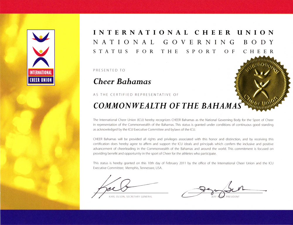 Bahamas Cheer Bahamas Nassau, New Providence The Commonwealth of the Bahamas President: Jennifer Roach Email: [email protected] Additional Info Website: www.cheerbahamas.com ICU Recognition Letter ICU Recognition Certificate